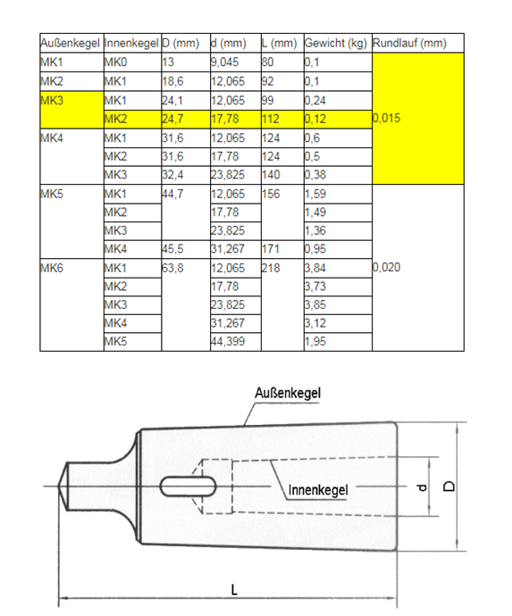 Adapter Konushülse gefertigt nach DIN2185. Außenkegel MK3, Innenkegel MK2