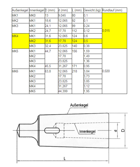 Adapter Konushülse gefertigt nach DIN2185. Außenkegel MK4, Innenkegel MK2