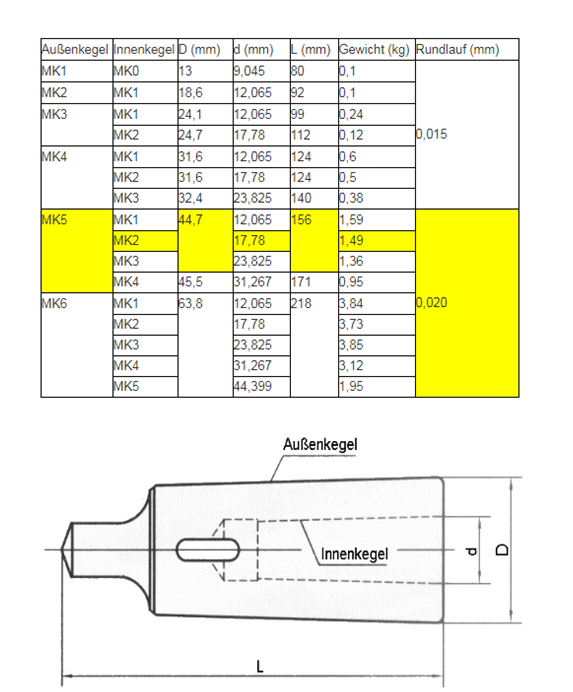 Adapter Konushülse gefertigt nach DIN2185. Außenkegel MK5, Innenkegel MK2