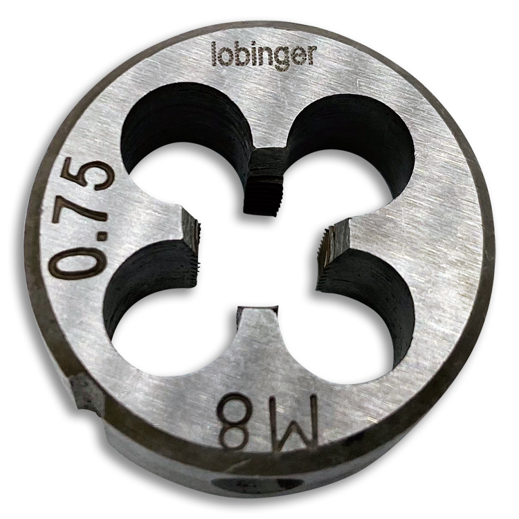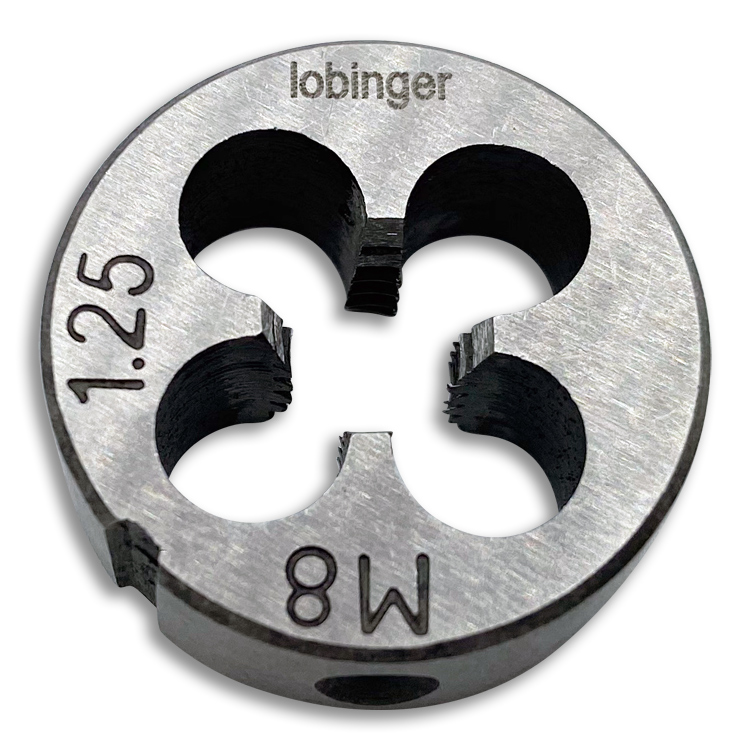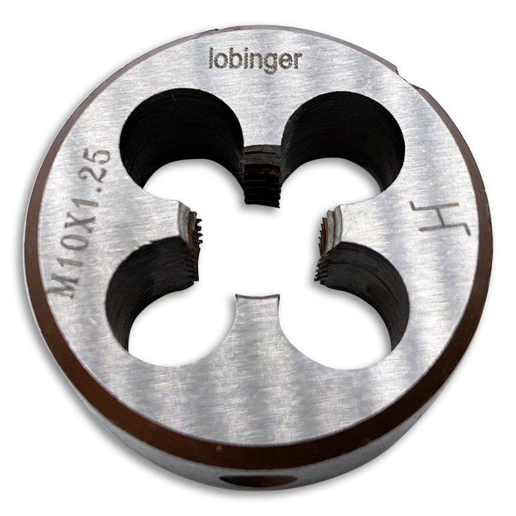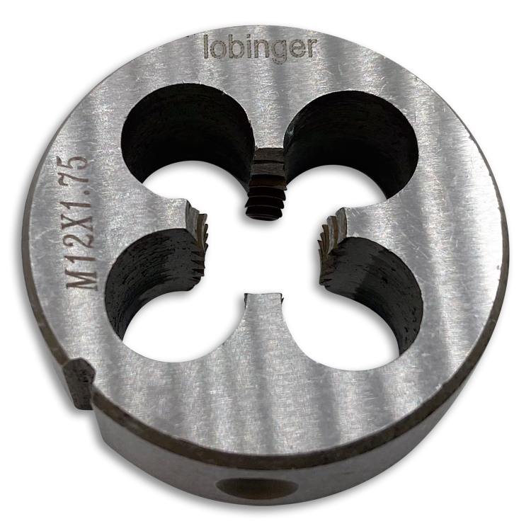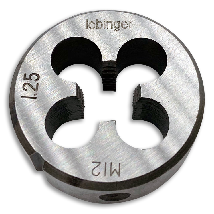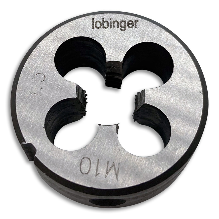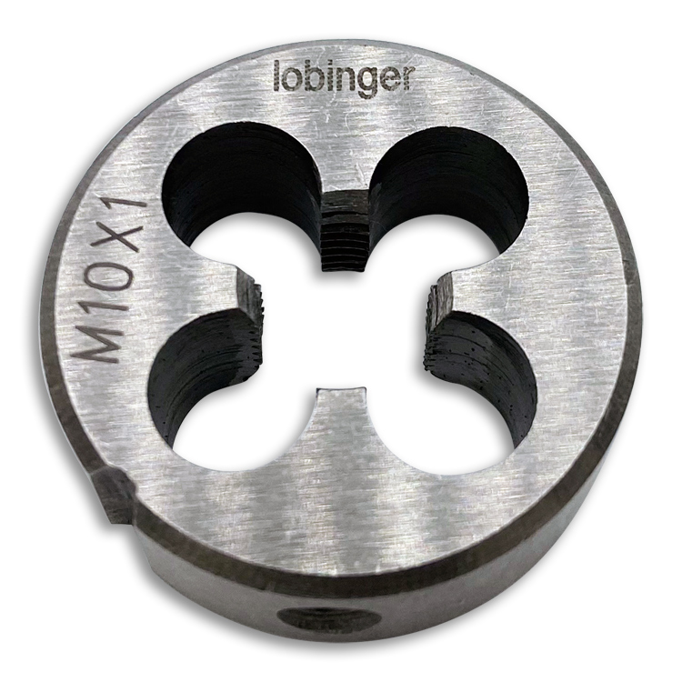 Rundes Schneideisen von Lobinger® nach DIN EN 22568 in geschlossener, vorgeschlitzter Ausführung (Form B) zur Herstellung metrischer ISO-Regelgewinde / ISO-Feingewinde nach DIN13 in Stahl bis 850 N/mm² Festigkeit.